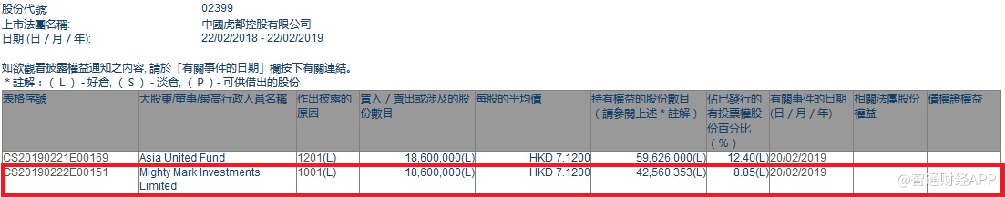 智通财经APP获悉,根据联交所资料显示,Mighty Mark Investments Ltd于2月20日增持虎都(02399)1860万股,每股作价7.12港元,总值1亿3243.2万港元,最新持股数增至4,256万股,最新持股比例增至8.85%。