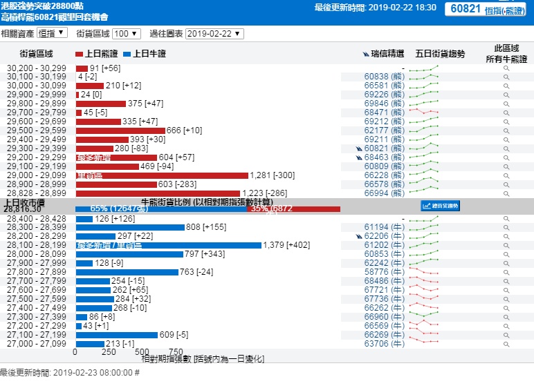 智通财经APP获悉,截至2月22日,恒指最新的牛熊街货比例65:35。从瑞信恒指牛熊证街货分布图中得到的数据显示,熊证街货重货区在29000-29099区间,该区间最新熊证数量为1281张,较上一交易日减少300张,最多新增区间在29200-29299区间,新增57张。牛证街货重货区在28100-28199区间,该区间最新牛证数量为1379张,比上一交易日增加402张。最多新增也在这一区间。