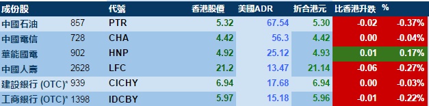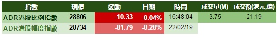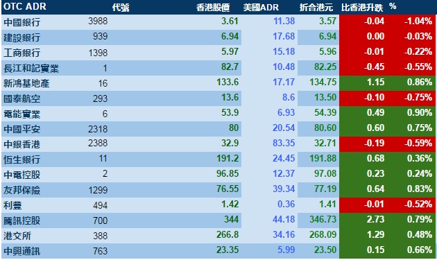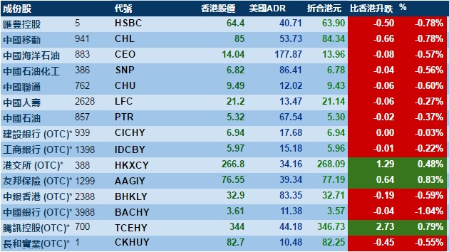 智通财经APP获悉,周五美股收涨,港股ADR指数出现小幅下跌,按比例计算,收报28806点跌10.33点或0.04%。大型蓝筹下跌居多,汇丰控股收报63.90元,较港股收跌0.78%;腾讯控股收报346.73元,较港股收跌0.79%。