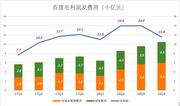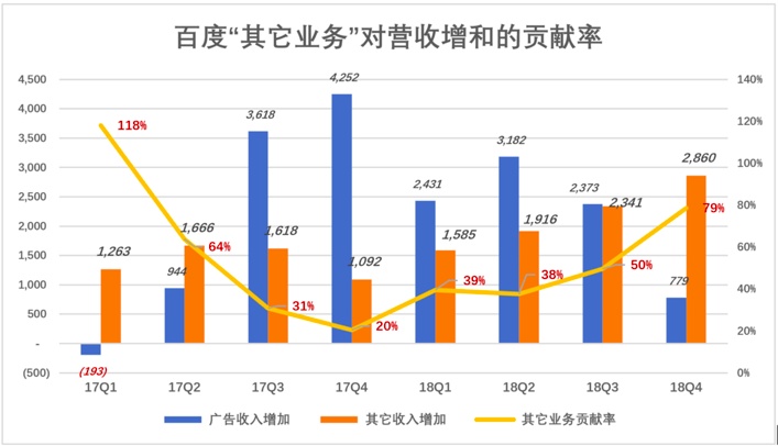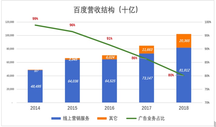 百度正在逐步改变收入来源单一的境况,2019年广告收入占比大概率降至80%以下。