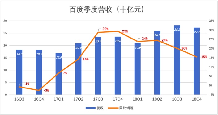北京时间2019年2月22日晨,百度发布了2018年Q4未经审计财报。报告显示,2018年Q4营收272亿,同比增长15.4%(若剔除增值税计算方式变更因素,2018年Q4营收同比增长22.3%)。2018财年,百度营收1022.8亿,首次突破1000亿,较2017财年增加20.6%。