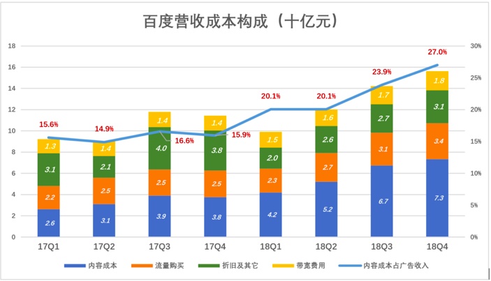 百度营收成本包括四大块:内容成本、流量购买、折旧及其它及带宽费用。