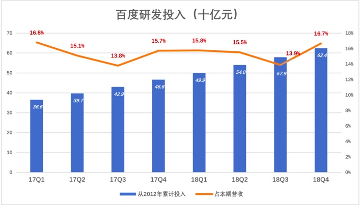 从2012年Q1到2018年Q4,百度研发投入累计达634亿。其中2018年Q4研发费用45.3亿,占本季营收的16.7%。四季度共有65个工作日,百度在每个工作日的研发投入达6969万。