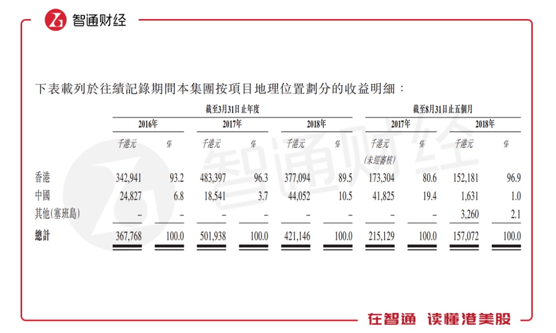 根据美亨实业招股书,公司主要的经营区域在香港和中国内地,并以香港为核心。2018财年,公司来自香港的收入为3.77亿港元(单位下同),占公司总收入的89.5%。截至2018年8月31日止5个月,公司来自香港的收入为1.52亿元,占比进一步提升止96.9%。