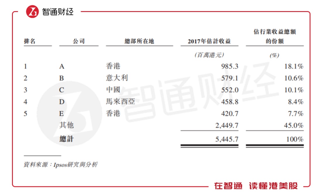 根据智通财经APP的了解,外墙及幕墙工程行业被视为成熟及集中度较高的行业,2017年业内有约30至40家大型公司从事外墙及幕墙工程。以2017年的收益计,香港外墙及幕墙工程行业的前五大公司占55%的市场份额,余下的市场参与者占45%的市场份额。美亨实业截至2018年3月止年度的收益约为3.77亿元,占2017年香港外墙及幕墙工程行业市场份额的6.9%。