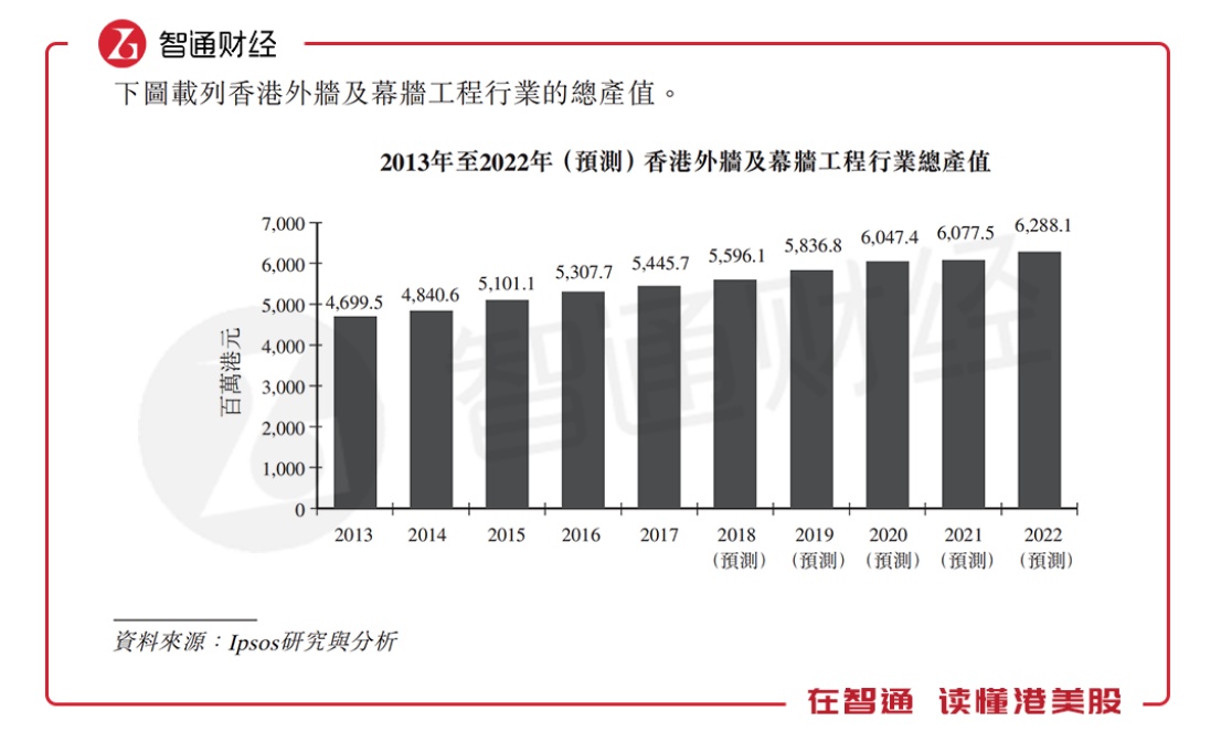 据Ipsos研究分析,香港外墙及幕墙工程行业的总产值由2013年的47亿元增至2017年的约54.46亿元,复合年增长率约3.8%。该行业的总产值预期将会延续上升势头,由2018年的55.96亿元增至2022年的62.88亿元,复合年增长率约为3%。