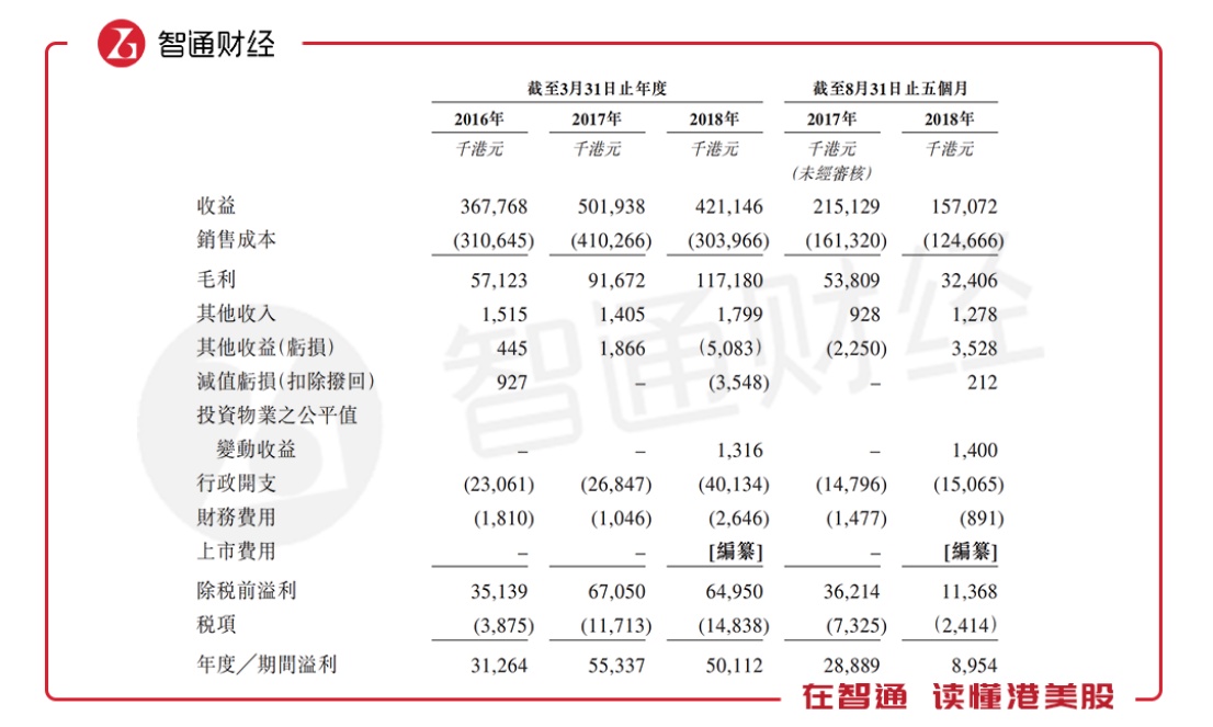 美亨实业招股书显示,公司营业收入近三年波动较大。2017财年公司实现收入5.02亿元,同比增长36.41%,创近年来收入新高。但2018财年公司并未能维持收入增长,全年收入下降16.13%至4.21亿元。截至2018年8月31日止5个月,公司收入进一步下滑26.78%至1.57亿元。