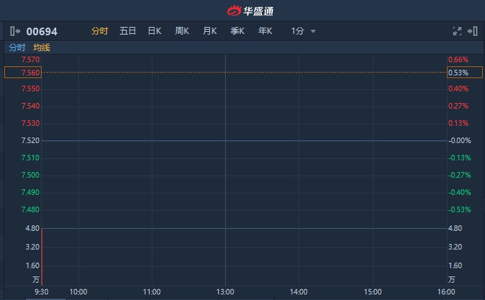 港股异动︱盘前现一手大宗成交涉资0.7亿 北京首都机场(00694)高开0.53%
