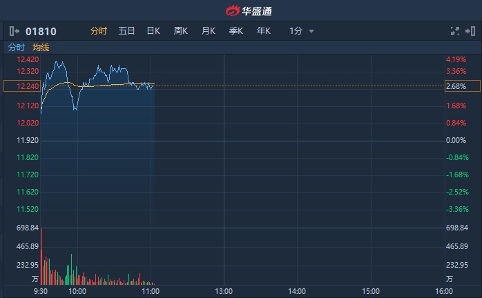 智通财经APP获悉,小米(01810)今日高开高走,宽幅震荡,截至11时2分,涨2.68%,报12.24港元,成交额达11.78亿港元。