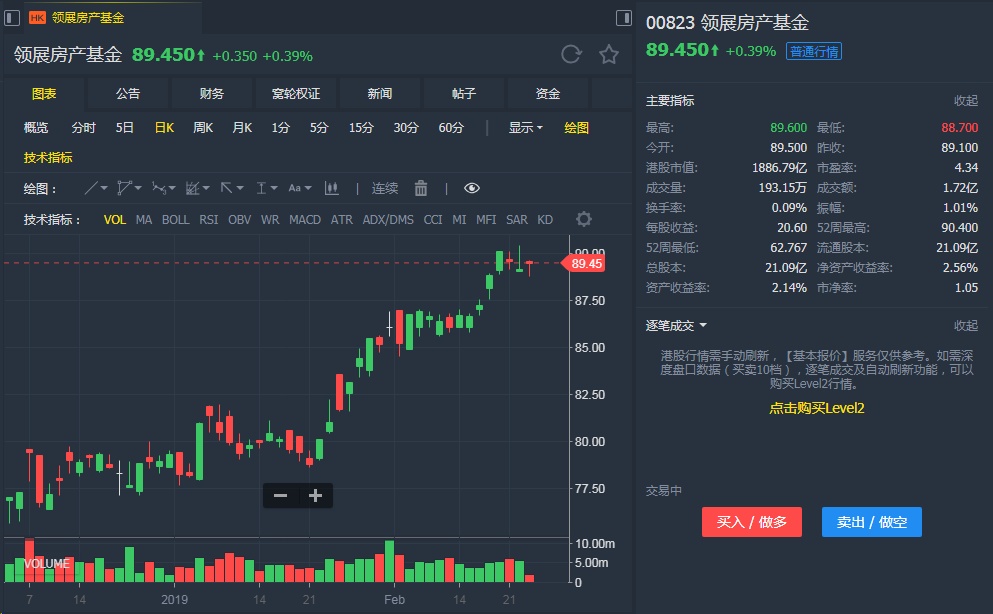 截至发稿,领展(00823)升0.39%,报89.450港元。