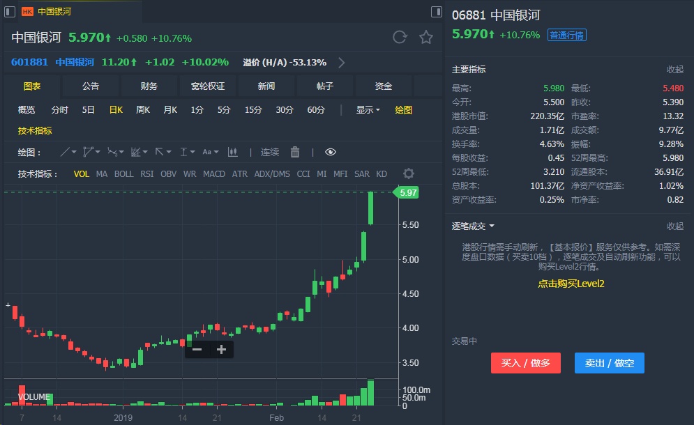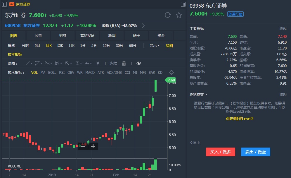 截至发稿,东方证券(03958)升9.99%,报7.600港元,中国银河(06881)升10.76%,报5.970港元。