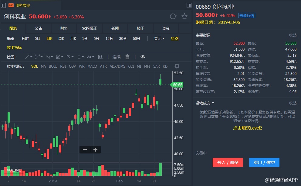截至发稿,创科实业(00669)升6.30%,报50.600港元。