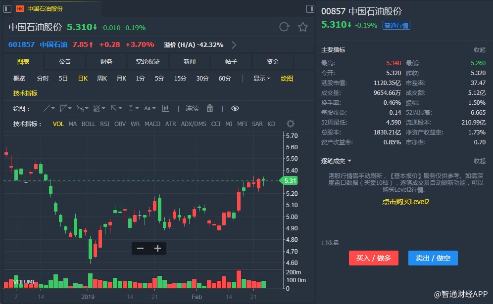 截至发稿,中国石油股份(00857)跌0.19%,报5.310港元。