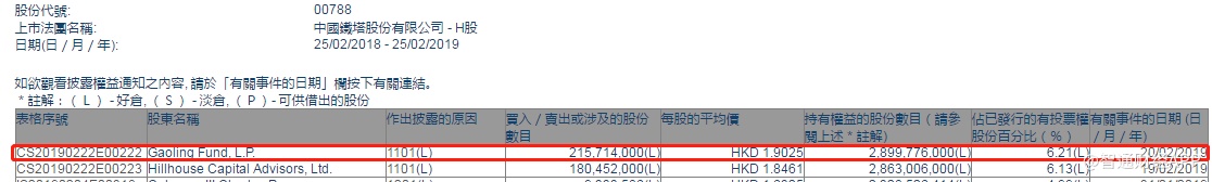 智通财经APP获悉,根据联交所资料显示,Gaoling Fund, L.P.于2月20日增持中国铁塔(00788)2.16亿股,每股作价1.9025港元,总值约4.11亿港元,最新持股数增至29.00亿股,最新持股比例增至6.21%。