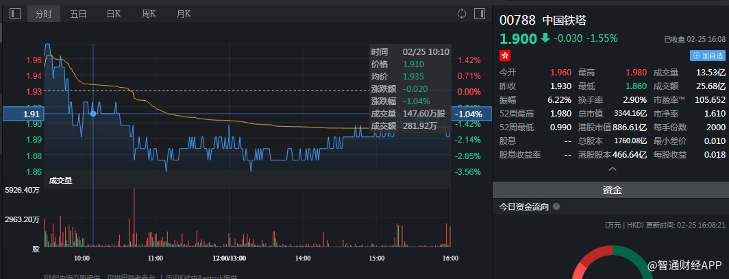 截至今日收盘,中国铁塔(00788)跌1.55%,报1.90港元。