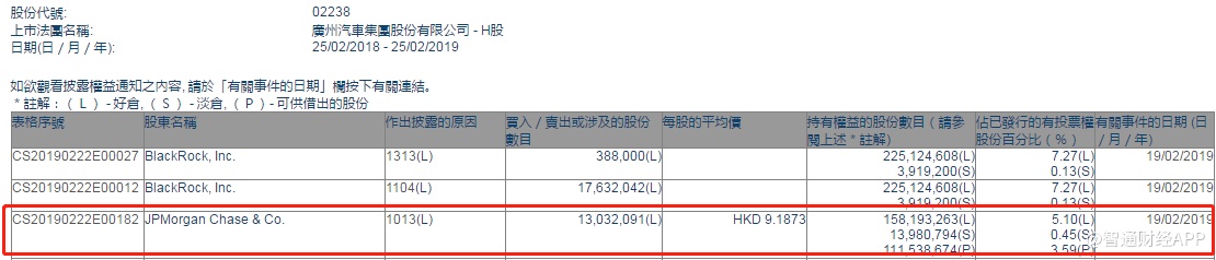 智通财经APP获悉,根据联交所资料显示,摩根大通于2月19日增持广汽集团(02238)1303万股,每股作价9.1873港元,总值约1.20亿港元,最新持股数增至1.58亿股,最新持股比例增至5.10%。