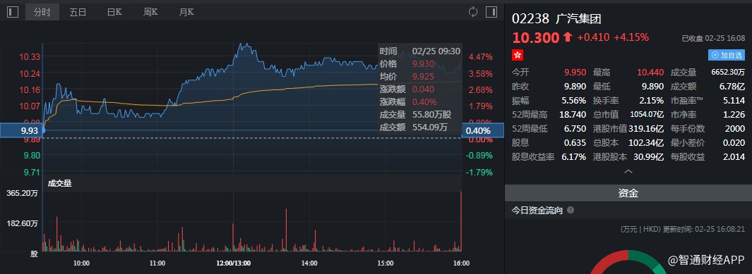截至今日收盘,广汽集团(02238)升4.15%,报10.3港元。
