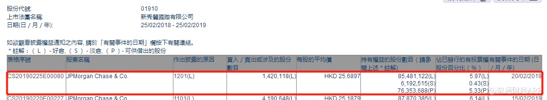 智通财经APP获悉,根据联交所资料显示,摩根大通于2月20日减持新秀丽(01910)142万股,每股作价25.69港元,总值3647.98万港元,最新持股数目8548万股,最新持股比例减至5.97%。