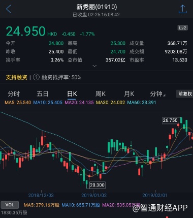 截至今日收盘,新秀丽(01910)跌1.77%,报24.950港元。