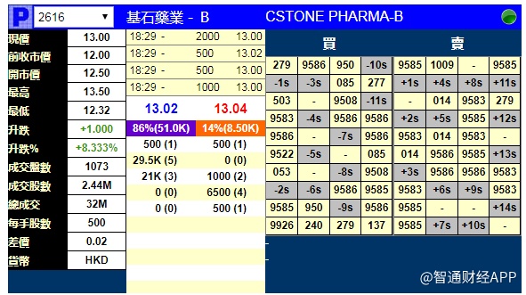 智通财经APP获悉,基石药业-B(02616)将于2月26日在香港挂牌,上市前夕,据辉立交易场资料显示,暗盘收报13.00港元,较招股价12.00港元,涨8.333%。每手500股,不计手续费,每手赚500港元。