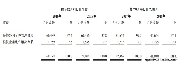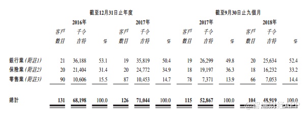 公司的客户主要来自银行、保险及零售业。其中来自银行的收入占比最高,2016年至2018年前9月收入占比分别为53.1%、50.4%及52.4%;来自保险业占比分别为31.4%、34.9%及33.2%。