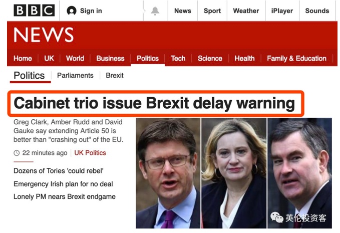 2019年2月22日,保守党政府三名内阁大臣联名在《每日邮报》撰文表示,如果首相特雷莎梅不能说服保守党内“硬脱欧派”支持最新的脱欧协议草案,那么他们将从内阁辞职,并投票支持英国延迟正式脱欧日(原定于2019年3月29日)。