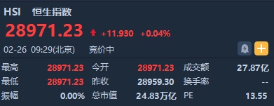 智通财经APP获悉,恒生指数开盘涨0.04%%,报28971.23点。国企指数张0.19%,报11653.15点。红筹指数张0.13%,报4565.49点。大市盘前成交27.87亿港元。隔夜美股小幅收涨,大型科技股集体收涨,港股ADR指数全日仅微升。