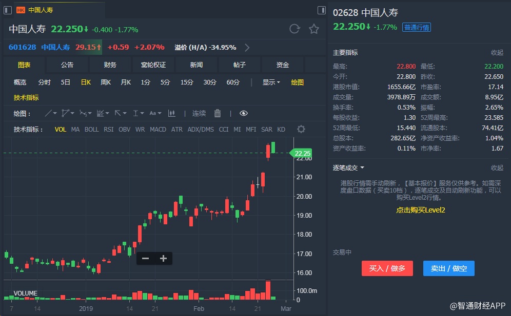 截至发稿,中国人寿(02628)跌1.77%,报22.250港元。