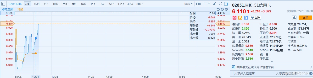 受利好消息刺激,51信用卡股价上涨,今日(2月26日)高开高走,截至发稿涨3.56%至6.11港元。实际上今年年初以来,51信用卡股价持续向好,1月份以来已经累计上涨41.44%,远远好于同期大盘的表现。