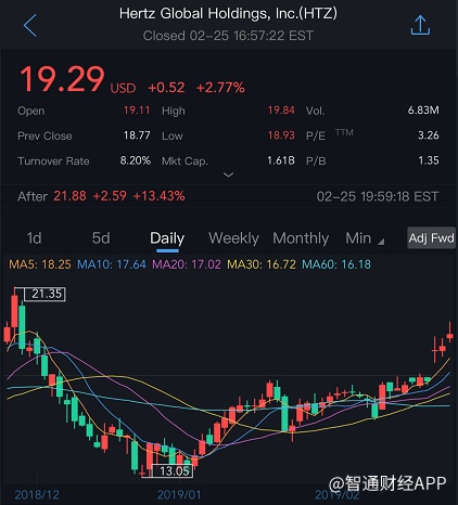 截至北京时间2月26号9:00AM,赫兹全球控股涨2.77%,报19.29美元。