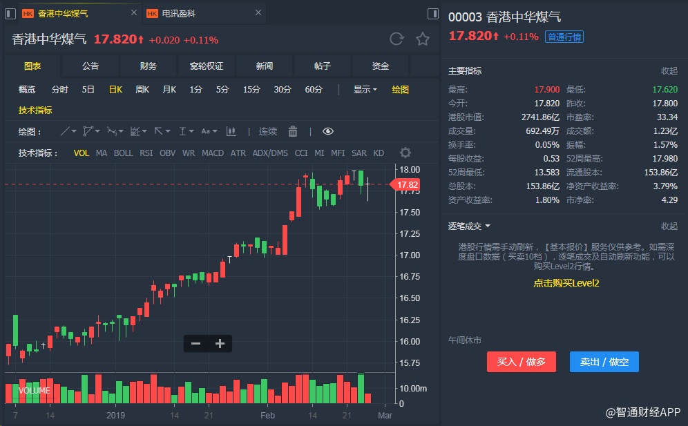截至发稿,香港中华煤气(00003)升0.11%,报17.820港元。