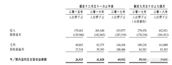 公司2015年、2016年、2017年及2018年前9月总收入分别1.79亿、2.65亿、4.36亿及4.42亿人民币,2017年同比增长64.52%,2018年前9月同比增长58.48%。 净利润分别2691.5万、4102.8万、6993.2万及5904.5万人民币,净利率分别为15.00%、15.46%、16.04%及13.33%。