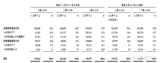 招股书数据显示,公司的主要收入来自于物业管理服务分部,2015年、2016年、2017年及2018年前9月的收入分别为1.49亿、2.25亿、3.18亿及3.22亿人民币;分部占总收入83.2%、84.7%、72.9%及72.8%。占比在下降,商业营运服务分部的收入占比从2015年的16.8%增长至27.2%。