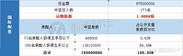 国际配售中签总人数273人,认购倍数为1.0004倍。