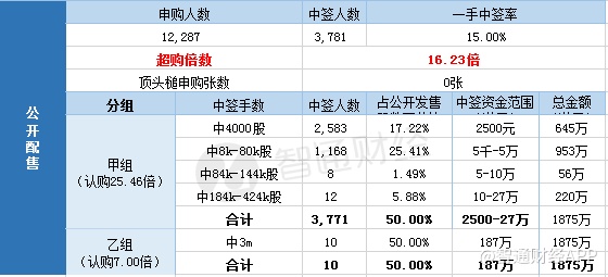 其中,公开配售申购人数12287人,一手中签率15%,认购倍数为16.23倍。