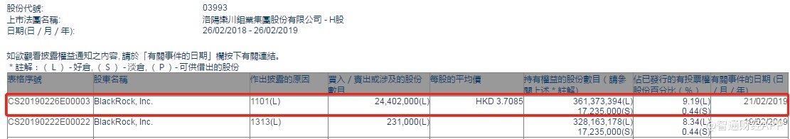 智通财经APP获悉,根据联交所资料显示,贝莱德于2月21日增持洛阳钼业(03993)2440万股,每股作价3.7085港元,总值约9048.74万港元,最新持股数增至3.61亿股,最新持股比例增至9.19%。