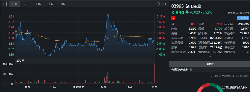 截至今日收盘,洛阳钼业(03993)跌0.52%,报3.84港元。