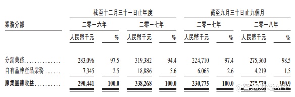 公司的业务主要分为分销业务和自有品牌产品业务,其中以分销业务为主,2016年、2017年、2018年9月30日止,分销业务的应收分别为2.83亿、3.19亿、2.75亿元人民币(下同),占总收入的比例分别为97.5%、94.4%、98.5%。