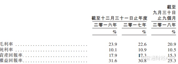 财务比率方面,毛利率分别为2016年、2017年、2018年9月30日止,毛利率分别为23.9%、22.6%、20.9%,保持稳定;资产回报率分别为17.9%、17.3%、15.3%。