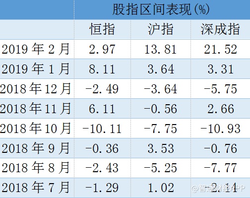 截至发稿,恒指2月累计上涨2.97%,同期沪指、深成指分别上涨13.81%与21.52%。下图统计了去年6月至今年2月的主要股指区间表现,可以看到,今年开年以来,两地市场的表现几乎可以用“靓眼”来形容。