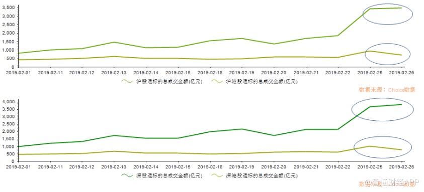 随着两地逐渐趋于技术牛市的形态,2月的沪(深)股通、沪(深)港股通标的总成交金额折线一路向上,近两日骤然上扬。