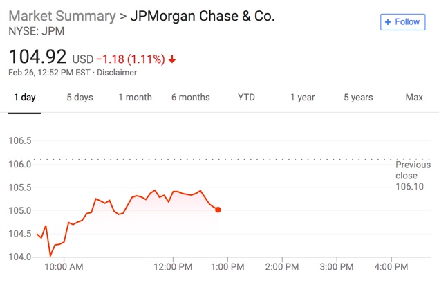 周二,截止美东时间12点52分,摩根大通股价下跌1.11%,暂报104.92美元。