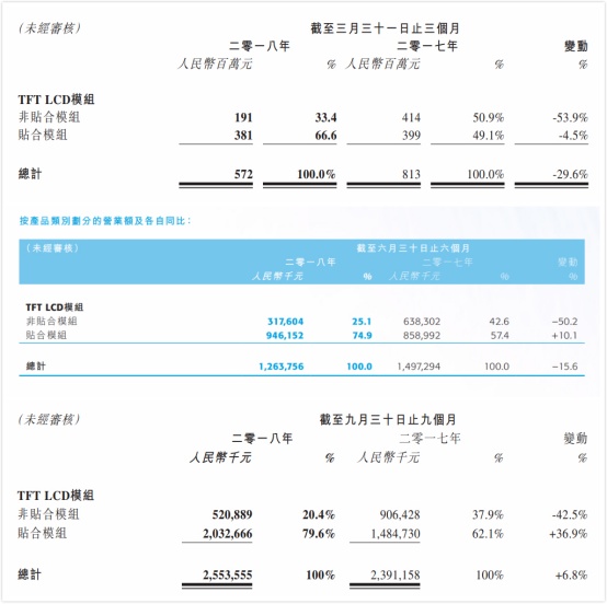 尽管华显光电整体的产品销量及营业额在持续下滑,但除去一季度以外,其贴合模组的营业额均有所增长,第三季度的同比增长幅度甚至达到36.9%。此外,贴合模组营业额占总营收的占比已从62.1%上升至79.6%。