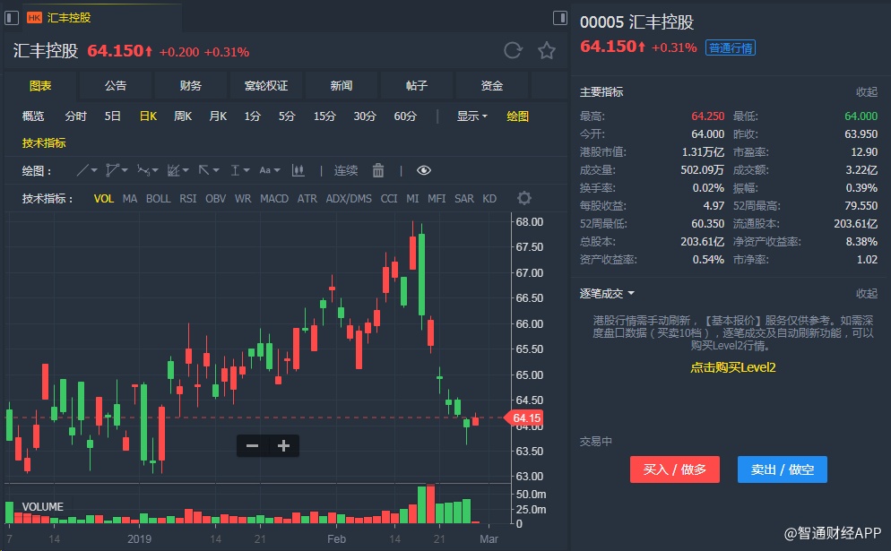 截至发稿,汇丰控股(00005)升0.31%,报64.150港元。