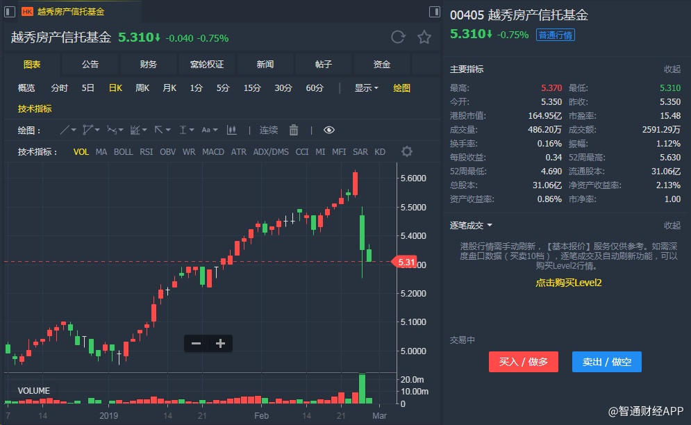 截至发稿,越秀房托(00405)跌0.75%,报5.310港元。