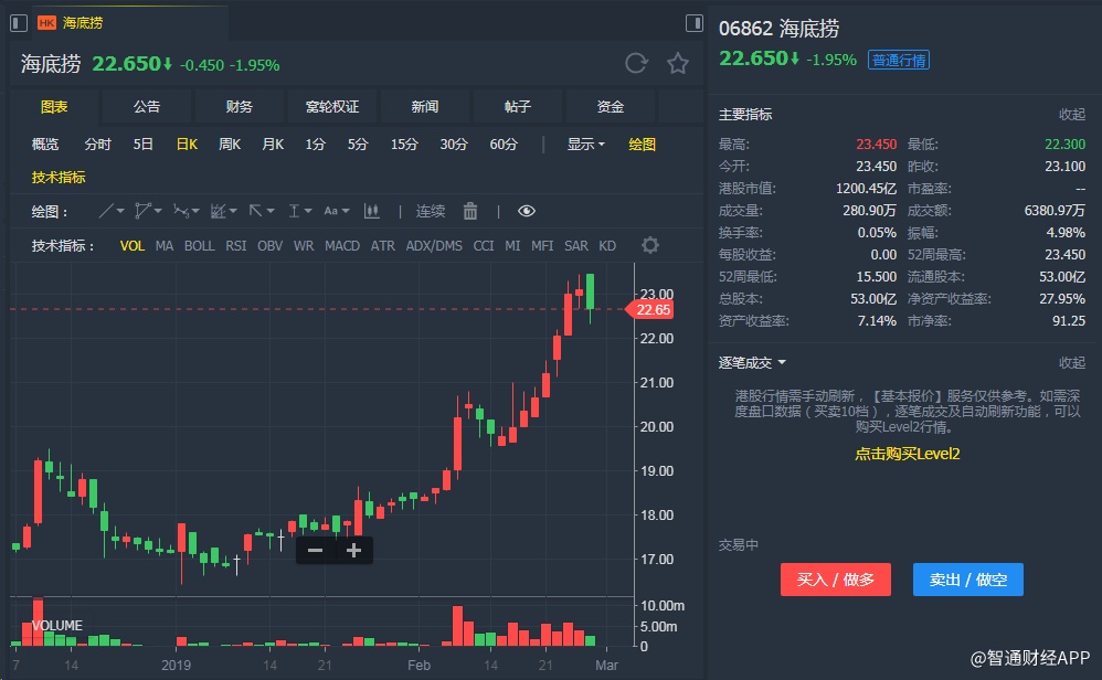 截至发稿,海底捞(06862)跌1.95%,报22.650港元。