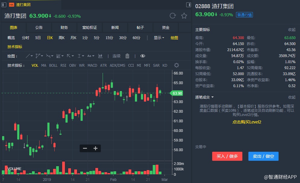 截至发稿,渣打集团(02888)跌0.93%,报63.900港元。