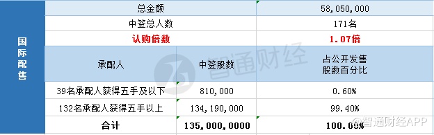 国际配售中签总人数171人,认购倍数为1.07倍。