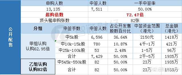 其中,公开配售申购人数13135人,一手中签率50%,认购倍数为72.47倍。