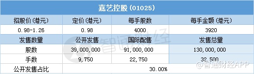 智通财经APP获悉,2月27日,嘉艺控股(01025)配售结束。配售招股价区间为0.98-1.26港元,最终定价0.98港元,每手3920港元。